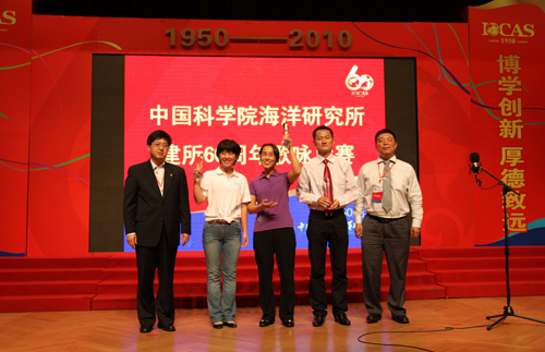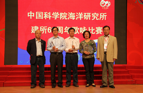 場(chǎng)內(nèi)花團(tuán)錦簇,氣氛熱烈。職工和研究生帶著金秋的喜悅,用誠摯的真情為海洋所60周年獻(xiàn)上了生日的祝福,展現(xiàn)了海洋所的精神風(fēng)貌,體現(xiàn)了全所職工的凝聚力和愛所熱情,也表現(xiàn)了全體職工和研究生團(tuán)結(jié)一致,為海洋所發(fā)展努力奮斗的信心和力量。一首首耳熟能詳、感人肺腑、催人奮進(jìn)的歌曲,使觀眾重溫了偉大祖國的光輝歷程,唱出了全所職工對(duì)海洋事業(yè)的無限熱愛。臺(tái)上演員們熱血沸騰、群情激昂,臺(tái)下觀眾被精彩的演繹和高超指揮深深感動(dòng),不時(shí)報(bào)以熱烈的掌聲。值得贊揚(yáng)的是已經(jīng)八十多高齡的劉瑞玉院士也登臺(tái)參加演出。整臺(tái)演出進(jìn)行了近二個(gè)小時(shí),過程中高潮迭起,精彩不斷。文獻(xiàn)信息中心參賽隊(duì)以創(chuàng)新的表演唱《繡紅旗》《陽光燦爛》將整個(gè)演出推向高潮,同時(shí)他們也獲得了全場(chǎng)最高分,贏得了比賽的一等獎(jiǎng)。