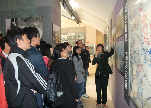 1947年5月,華東野戰軍在陳毅、粟裕的指揮下,經過浴血奮戰,一舉殲滅了國民黨最精銳的部隊——七十四師及其援軍,孟良崮也因此役而揚名海外。當同學們走進孟良崮革命紀念基地,首先看到孟良崮革命英雄紀念碑莊嚴、肅穆的聳立在綠樹環繞的廣場上。紀念碑后面就是孟良崮革命紀念館,展館的外墻掛板鑲嵌有194700枚彈殼,象征著戰爭在1947年打響。展館共分為四部分,分別向我們展示了當時敵我兵力的懸殊,我軍戰術的成功以及人民群眾對我軍的支持。