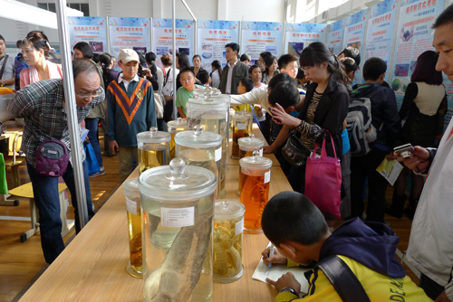 海洋知識(shí)展區(qū)內(nèi),前來參觀的市民絡(luò)繹不絕,許多中小學(xué)生拿著海洋知識(shí)競賽答題在展板前尋找答案,并不時(shí)向志愿者詢問。各式的海洋生物標(biāo)本吸引了許多參觀者的目光,志愿者耐心的為同學(xué)們講解標(biāo)本的產(chǎn)地、學(xué)名、習(xí)性和制作保存方法等知識(shí)。海洋微觀世界——有孔蟲展架前,參觀者對(duì)有孔蟲的千姿百態(tài)、美輪美奐贊不絕口。