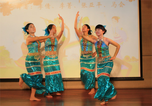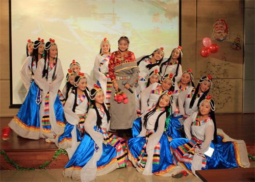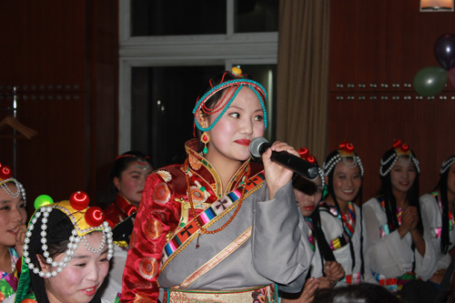 西藏班的小伙伴兒們則帶來了具有濃郁民族特色的歌舞。一曲高亢的《瑪吉阿媽》和藏族原生態的舞蹈《阿媽的酥油燈》,則展現了藏族同胞能歌善舞的藝術天賦,讓獨唱變成了大合唱,臺上臺下互動交融,高潮迭起。晚會的最后,雙方的老師在同學們熱烈的掌聲中即興表演了歌舞。一臺精彩、火爆的晚會使遠離親人的藏族小伙伴兒們感受到節日的喜慶氣氛,也讓金屬所的師生們從藏族學生純真、友愛的表現中得到了心靈的凈化。