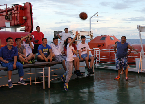 “科學(xué)”號克服海上條件限制,在船甲板的有限空間上整理出籃球場地并自制了簡易籃球架,組織全體船隊員開展了一次別開生面的投籃比賽。比賽分為定點投籃和限時投籃兩個項目,全體船員、科考隊員在保證安全和工作的前提下踴躍參與,簡陋的設(shè)施與場地阻擋不了參賽隊員的熱情,充分展示了海洋所人不畏艱險、積極樂觀的科考精神,進(jìn)一步增進(jìn)了船隊員間的友誼,為順利完成科考任務(wù)營造了良好的文化氛圍。