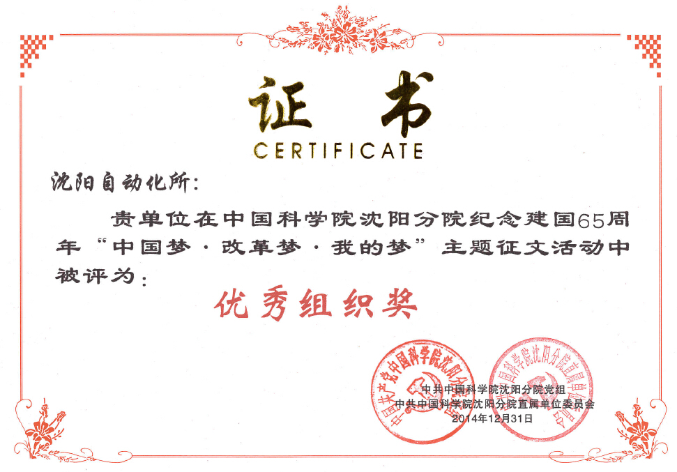 近日,從中國科學院沈陽分院獲悉,中國科學院沈陽自動化研究所在2014年參加的沈陽分院紀念建國65周年“中國夢?改革夢?我的夢”主題征文活動中獲評優秀組織獎。由沈陽自動化所選送的6篇作品全部獲獎。
