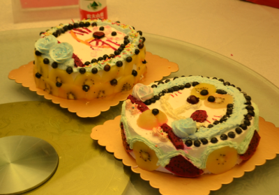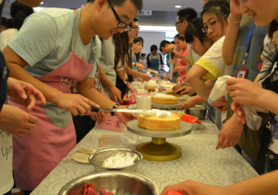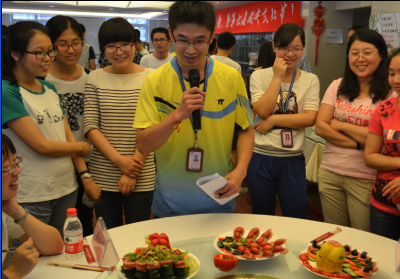 活動一開始,所有參賽選手和觀眾在專業老師的指導下,學習如何包粽子,并齊心協力完成200多個粽子。熱身之后,首先進入“創意涼菜”環節。各隊的涼菜造型各異,口味獨特,有“孔雀東南飛”、“夏日風光”、“清涼一夏”等,更有DNL08研究部調制的“秘制蘸醬”,獲得評委們的好評。之后的“精雕蛋糕”環節,選手們更是創意爆棚,大家用水果拼出了不同圖案,“盛夏的果實”、“哆啦B夢”、“花開富貴”等,并輔以雕花,不僅給味蕾最高的感受,更是一場視覺盛宴,充分展示了所內師生靈活的思維和動手能力,五室的創意雙層蛋糕“謝謝你的愛”最終贏得評委的一致贊賞。