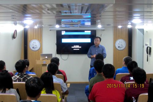 11月14日,海洋所黨委書記、熱帶西太平洋主流系和暖池綜合考察航次首席科學(xué)家王凡為完成科考任務(wù)正在返程途中的“科學(xué)”號全體黨員和入黨積極分子上了一堂精彩的“三嚴三實”專題黨課。
