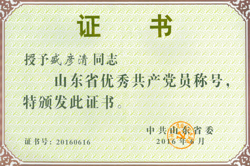 2016年6月30日,山東省慶祝中國共產黨成立95周年大會在濟南舉行。大會表彰了200名“山東省優秀共產黨員”,100名“山東省優秀黨務工作者”,199個“山東省先進基層黨組織”。中國科學院煙臺海岸帶研究所研究員盛彥清同志獲得“山東省優秀共產黨員”稱號。煙臺市有“山東省優秀共產黨員”17人,盛彥清同志與獲獎人員一起到濟南參加了表彰大會。
