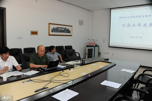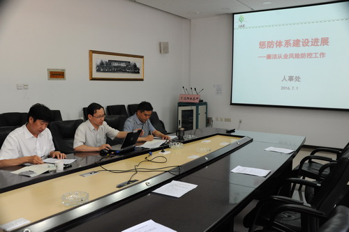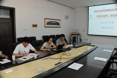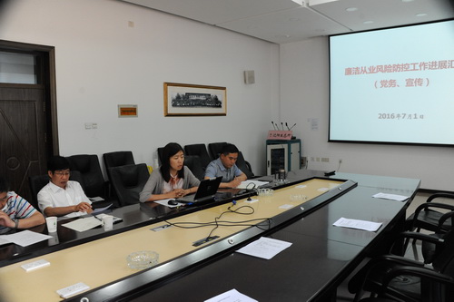 劉麗、葉漢峰、趙穎(女)、李樹軍、付彬、李永峰、宗文君、孫雨等8位同志分別代表科技處、人事處、財務處、資產處、研究生部、綜合管理處、辦公室(黨務)和工會,匯報了本部門廉潔從業風險防控工作進展和下一步工作計劃。