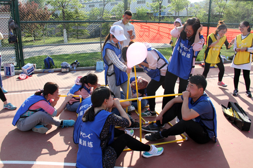 參加活動的研究生們被隨機分成紅黃藍三隊,在隊長的帶領下,團結一心、合作奮進,進行了“袋鼠跳”、“呼吸的力量”和“激情119”等三項集體項目的挑戰。在教練的引導和隊友的鼓勵下,所有隊員均成功完成了挑戰項目。