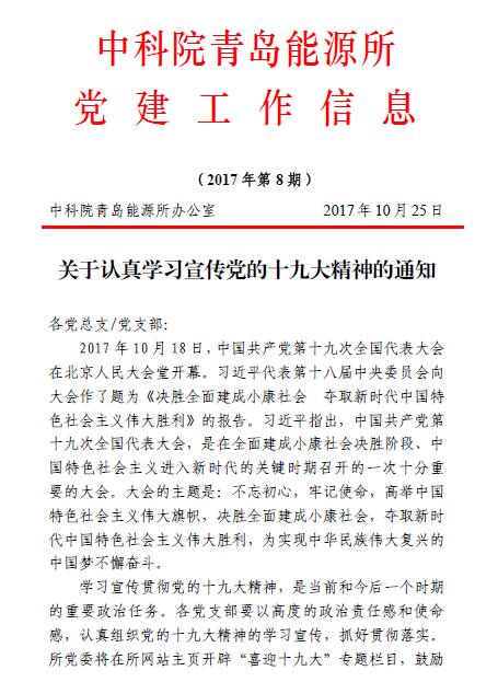 黨的十九大勝利召開后,青島能源所黨委高度重視、精心組織,帶動全所各級黨組織迅速掀起十九大精神學習熱潮。
