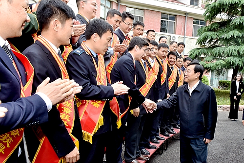 省委常委、組織部長楊東奇與獲獎章人員握手并表示祝賀