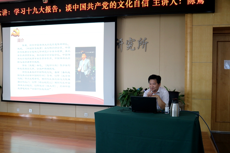 9月26日下午,中國海洋大學黨委宣傳部部長陳鷟教授應邀再次作客中國科學院青島生物能源與過程研究所“清源聚能”文化論壇,做了題為“學習十九大報告,談中國共產黨的文化自信”的精彩報告。研究所全體黨員、入黨積極分子共200余人到場聆聽了報告。 陳鷟深入闡釋了十九大報告中文化自信的豐富內涵,從中國共產黨的文化根基、中國歷史和傳統文化等方面分析了“堅定文化自信 弘揚傳統文化”的現實意義和重要性。