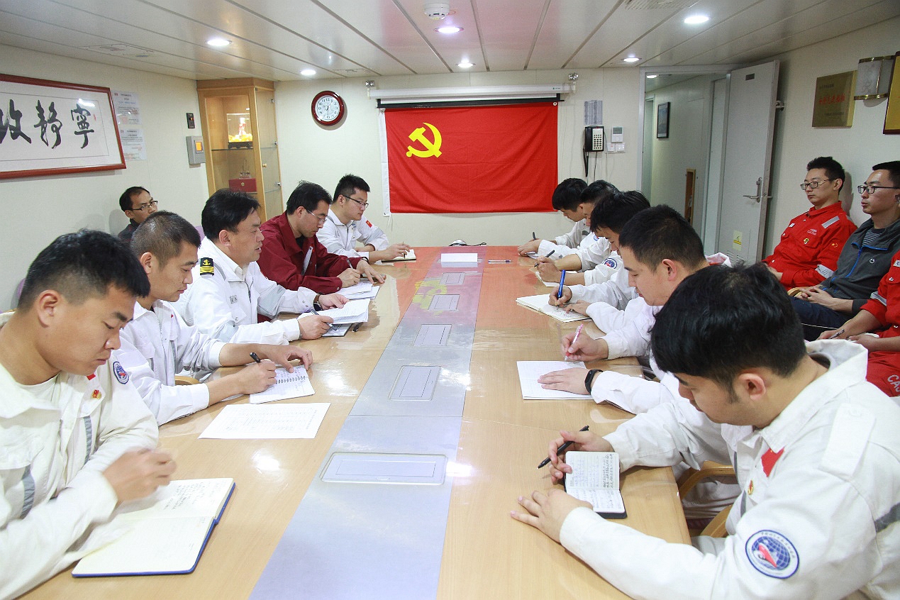 深海大洋科學(xué)考察具有航次任務(wù)重、出海工作時(shí)間長(zhǎng)、黨員流動(dòng)性大的特點(diǎn),為深入貫徹落實(shí)《中國(guó)共產(chǎn)黨支部工作條例(試行)》規(guī)定,把黨建工作建立在一線,以黨建促業(yè)務(wù),讓科學(xué)考察船黨建工作更加規(guī)范化、標(biāo)準(zhǔn)化和常態(tài)化,經(jīng)中科院海洋所黨委批準(zhǔn),依托科學(xué)考察船運(yùn)管中心黨支部,在“科學(xué)”輪執(zhí)行海上科學(xué)考察任務(wù)期間成立“海上堡壘”臨時(shí)黨支部。