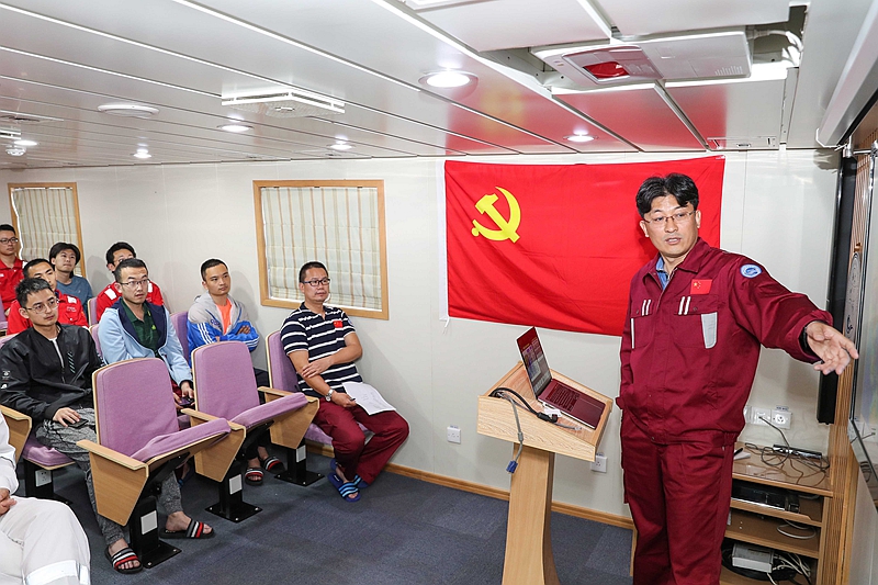 5月21日,正駛往馬里亞納海溝的“科學”號科考船上,“海上堡壘”臨時黨支部舉行“海洋強國 筑夢深藍”主題黨日活動,臨時黨支部全體黨員和部分科考隊員等40多人參加活動。