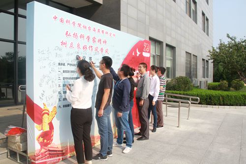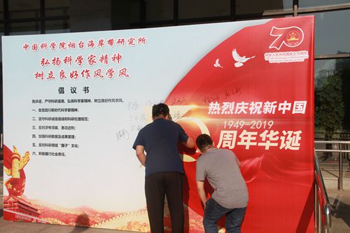 9月27-30日,在祖國70年華誕來臨之際,為大力弘揚(yáng)科學(xué)家精神,教育和引導(dǎo)科研人員樹立良好作風(fēng)學(xué)風(fēng),中國科學(xué)院煙臺(tái)海岸帶研究所黨政領(lǐng)導(dǎo)班子成員、職工、研究生近200人鄭重簽名,承諾“弘揚(yáng)科學(xué)家精神、樹立良好作風(fēng)學(xué)風(fēng)”,表達(dá)了作為科技工作者堅(jiān)定科技報(bào)國的決心和信念,并向祖國獻(xiàn)上祝福。