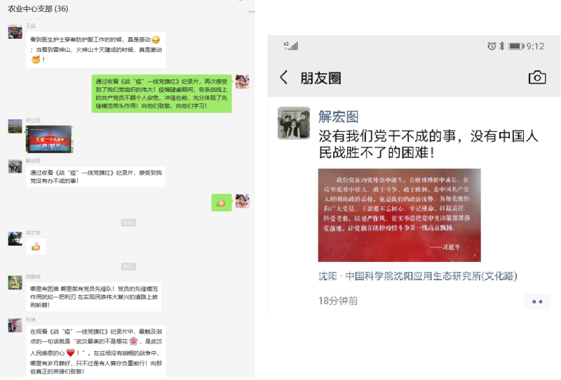 6月30日,作為七一特別黨課,所黨委還組織全所黨員在線觀看了紀錄片《戰“疫”一線黨旗紅》,黨員們受到的觸動很大,紛紛通過微信群交流觀影感受。