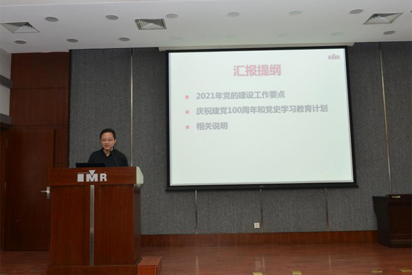 黨辦副主任趙翔宇介紹了金屬所“2021年黨的建設工作要點”,結合黨建具體任務臺帳詳細解讀了年內黨建重點工作任務,介紹了金屬所“慶祝建黨100周年和黨史學習教育計劃”、意識形態工作責任制主要內容以及各支部近期學習重點任務、對制訂“三會一課”工作計劃的要求等內容。