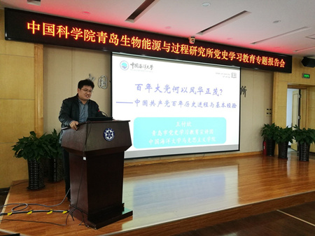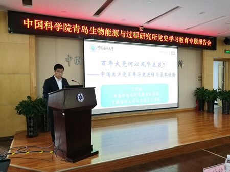 4月27日下午,青島能源所召開黨史學習教育專題報告會。研究所全體黨員、申請入黨人員、共青團員和感興趣的職工、學生共300余人在現場或通過視頻形式參加了會議。會議由紀委書記李明主持。