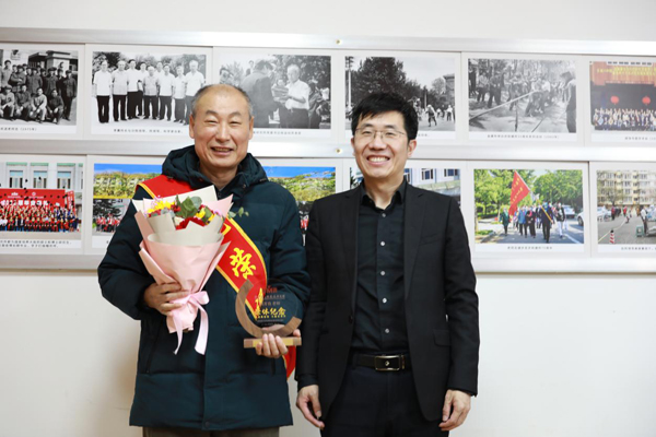 卓君臣向新退休職工代表侯萬良研究員發放“榮休紀念牌”
