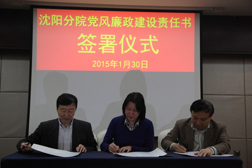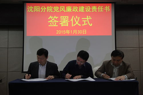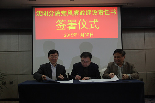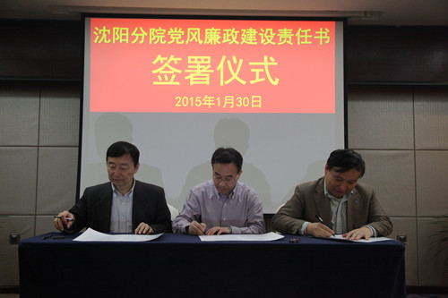 2015年1月30日,沈陽分院組織與系統(tǒng)各研究所簽訂黨風(fēng)廉政建設(shè)責(zé)任書。受院黨組委托沈陽分院院長韓恩厚、黨組書記王啟堯與各研究所所長、黨委書記分別簽訂了個性化反腐倡廉建設(shè)責(zé)任書、黨風(fēng)廉政建設(shè)責(zé)任書,同時與分院領(lǐng)導(dǎo)班子其他兩位成員也簽訂了個性化責(zé)任書。沈陽分院黨組副書記、紀(jì)檢組長徐巖主持責(zé)任書簽訂儀式。