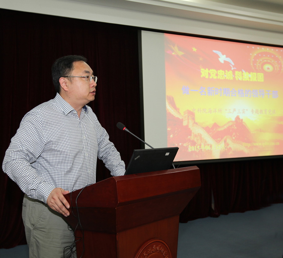 6月12日上午,海洋所召開處級以上領導干部大會,黨委書記王凡為參會人員講“三嚴三實”專題黨課。黨政領導班子成員、紀委委員、副處以上領導干部、實驗室正副主任、黨支部書記等近60人參加會議,會議由黨委副書記兼紀委書記楊紅生主持。