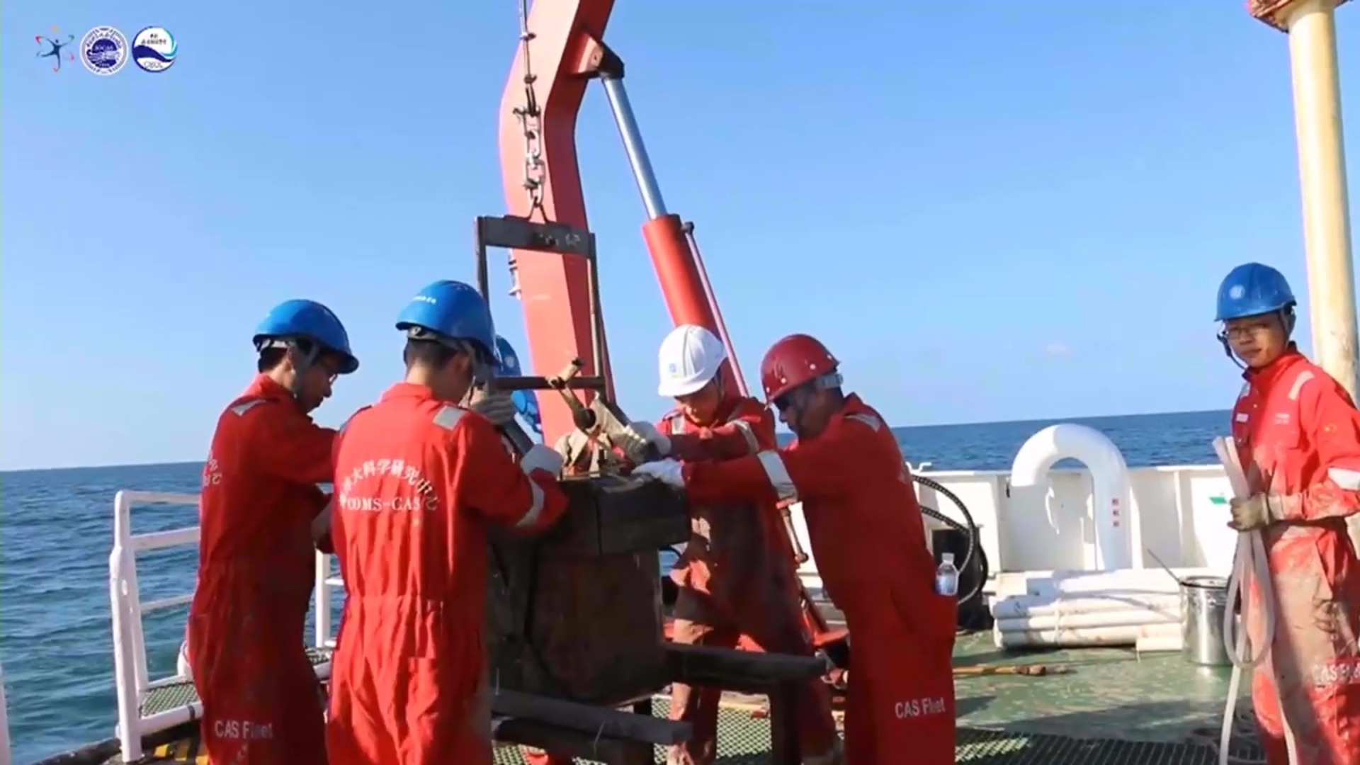 張?chǎng)窝芯繂T展示深海冷泉科考作業(yè)