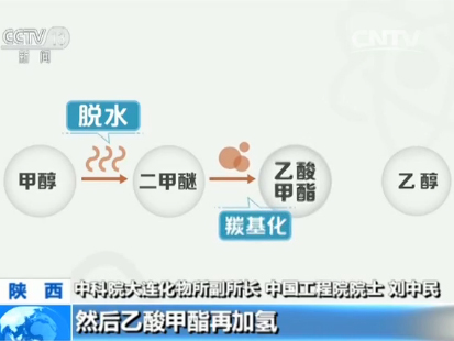 中科院大連化物所副所長 中國工程院院士 劉中民:我們這個技術路線是通過煤先做成甲醇,再接著轉化成乙醇。它的技術核心實際上是,把甲醇、把二甲醚和一氧化碳反應做成乙酸甲酯,然后乙酸甲酯再加氫變成乙醇和甲醇,最核心的還是兩個過程的催化劑。這個催化劑要求高效,長期穩定。原來世界上沒有過類似的。