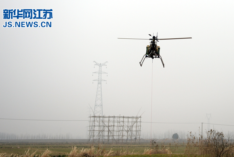 新華網南京1月16日電 當日,江蘇鹽城供電公司首次采用無人直升機架設輸電線路。據了解,本次架線需要跨越道路、河流和大片樹林,施工難度較大,采用傳統的人工牽引步行方式放線需一個星期,而使用無人直升機放線方式僅需1天即可完成。同時,直升機放線對環境影響小,避免了對農田青苗和樹林的破壞。(顧鋒明 攝)