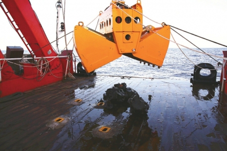 9日2時16分,電視抓斗下水。作為本航次第一抓,隊員們都期待能有所收獲和驚喜。經過6次調整船的位置,4時47分,抓斗抓取樣品回船,共抓取到十余塊大小不一的巖石樣品。