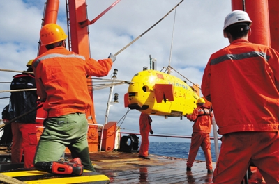 科考船“向陽紅10號”上,作業組多人從各個方向拉起“潛龍二號”,準備入水。當地時間2月14日,西南印度洋,1.5噸重的“潛龍二號”下水開始進行一天多的勘測。此次的勘探目標是西南印度洋一塊30多平方公里熱液區的海底,機器人將沿著線路在海底來回橫掃,其攜帶的各種傳感器將采集各類信息。2月15日晚,完成任務浮出水面的“潛龍二號”被回收。從初步數據分析情況看,探測數據都被導出且基本有效,這意味著“潛龍二號”的首次試驗性應用任務成功完成。新京報特派記者 金煜 攝