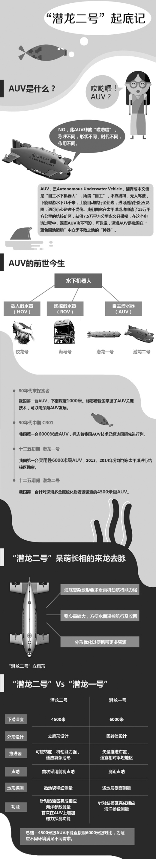 這不是一條普通的魚,它的全名叫4500米級(jí)深海資源自主勘查系統(tǒng)“潛龍二號(hào)”,這是我國首臺(tái)自主研發(fā)的4500米級(jí)自主水下機(jī)器人。這些天,在國際海底管理局與我國簽訂的多金屬硫化物勘探合同區(qū)——西南印度洋一片熱液區(qū)的海底,它按照預(yù)先設(shè)計(jì)的路線,首次堅(jiān)持了整整30個(gè)小時(shí)的全航程探測(cè),首次探測(cè)了海底山脈(即洋中脊)熱液區(qū),并獲得了精細(xì)的三維地形地貌數(shù)據(jù)和300多張高分辨率連續(xù)照片……實(shí)現(xiàn)了中國深海科考的多個(gè)“首次”。
