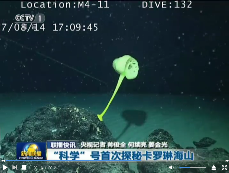 正在執(zhí)行中科院海洋先導專項的新一代海洋科學綜合考察船“科學”號近日在西太平洋卡羅琳海山進行了首次下潛作業(yè),通過搭載的“發(fā)現(xiàn)”號潛器采集到一株約80厘米高的淡黃色海綿、一株稀有的偕老同穴海綿等。這也是人類首次對卡羅琳海山進行科學考察。