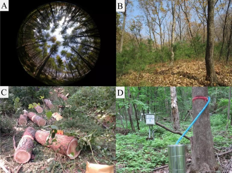 森林保育技術研究(A:林窗解譯;B:林下更新紅松;C:樹干解析;D:樹干徑流采集)