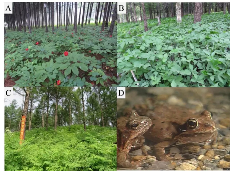 林下資源高效利用技術研究(A:林下人參;B:林下大葉芹;C:林下刺龍芽;D:林蛙)