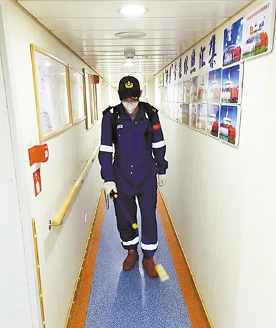 下圖 “科學”號科研人員進行船艙內(nèi)消毒。