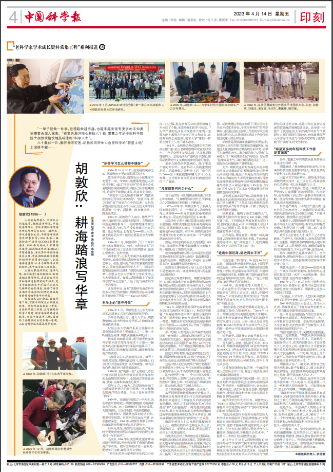 如今,胡敦欣已是桃李滿天下。當年受他指導、幫助的年輕人已成長為各領域的學術帶頭人,在各自領域為國家海洋事業接力奮斗。