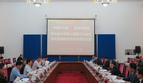 5月5日,中國科學院與青島市人民政府第二輪全面戰略合作協議在青島簽署,同時舉行了中科院與青島市的院市合作領導小組第三次會議,施爾畏副院長、科技促進發展局嚴慶局長、沈陽分院韓恩厚院長、青島市張新起市長等領導,中科院各駐青機構及山東中心負責人等60余人參會。青島市委常委、副市長王廣正主持了會議。