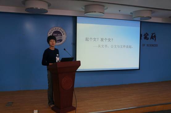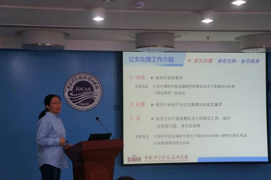 在培訓會上,院辦公廳文書處劉陽作了“中國科學院公文處理辦法解析及實例研討”專題報告,金屬所辦公室何孝瑛作了“淺談金屬所公文處理工作”專題報告,大連化物所于沁作了“二期檔案進館工作交流”專題報告。參訓人員根據報告內容,緊密結合各自的工作,就公文擬制和修改、公文核稿、公文流轉、公文與檔案管理的銜接、二期檔案進館工作流程及個人工作中遇到的具體問題和體會,進行了熱烈研討和交流,并結合海洋所二期檔案進館工作,現場對其檔案整理工作進行了研討和交流。