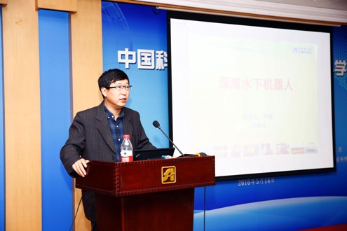 “潛龍二號”總設計師、沈陽自動化研究所劉健研究員做了題為《深海水下機器人》科普報告,介紹國內外水下機器人的研究成果,特別介紹了“潛龍二號”研發過程,與聽眾分享了大洋40航次實驗的苦與樂,并介紹了機器人發展的未來。報告后,劉老師與現場學生進行了精彩的互動,博得了同學們一陣陣熱烈的掌聲。