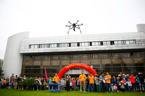 啟動儀式后,在沈陽自動化所園區花壇舉行了一場飛行表演。沈陽自動化所自主研制的六軸飛行器擔任了這次表演的主角。在志愿者操作下,飛行器穩穩地起飛,在空中旋繞飛行。參觀者興趣高昂,將花壇團團圍住,興致勃勃地觀看這場表演。