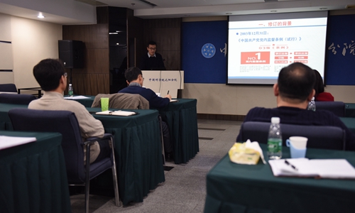 會上,首先由王東升同志作題為《十八屆六中全會精神學習體會》的報告,對十八屆六中全會審議通過的《關于新形勢下黨內政治生活的若干準則》和《中國共產黨黨內監督條例》進行了的講解,并結合自身工作實踐,介紹了如何將促進科技成果轉化工作與從嚴治黨要求緊密結合,把全面貫徹落實十八屆六中全會精神落在實處的個人學習體會。隨后,崔淑霞和劉勇兩位同志分別以《關于新形勢下黨內政治生活的若干準則解讀》和《<中國共產黨黨內監督條例>交流報告》為題作報告。崔淑霞結合個人學習體會強調全體黨員應嚴格黨的組織生活制度,保持清正廉潔的政治本色。劉勇通過查閱大量資料,就《條例》修訂的背景、原則和過程作了詳細說明,并對《條例》部分內容深入講述了自身的理解和體會。