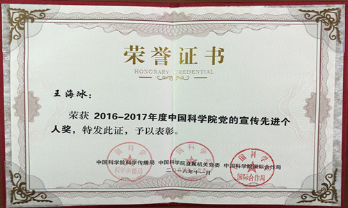日前,為鼓勵在中國科學院科學傳播工作中做出突出成績的集體和個人,依據有關管理辦法,院科學傳播局、直屬機關黨委、國際合作局堅持 “科學嚴謹、目標導向、公正公平、注重實效” 的原則,共同組織開展了2016—2017年度中國科學院科學傳播獎的評選工作,共評選出先進單位獎10個,單項集體獎24個,先進個人獎24個。沈陽分院榮獲科學傳播先進單位獎、黨的宣傳先進單位獎,王海冰獲得黨的宣傳先進個人獎。