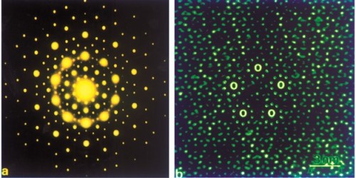 Ti-Ni 準晶相的高分辨電子顯微鏡圖(左)和五次對稱衍射圖(右)