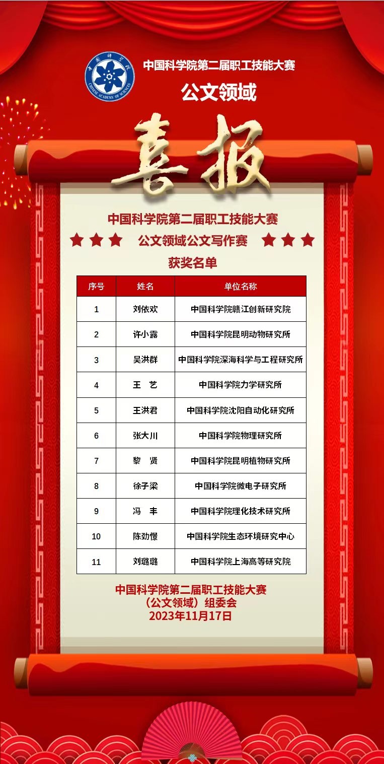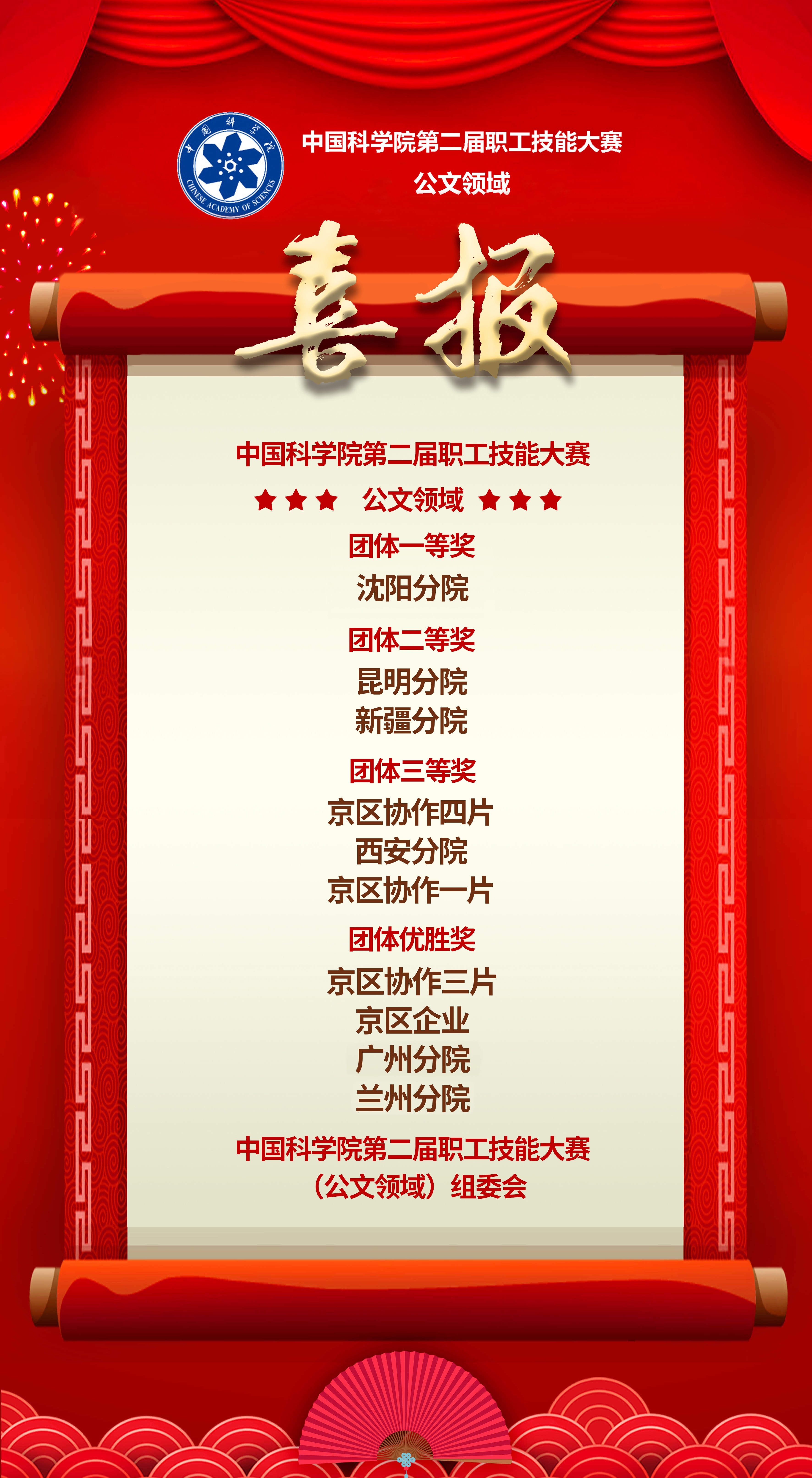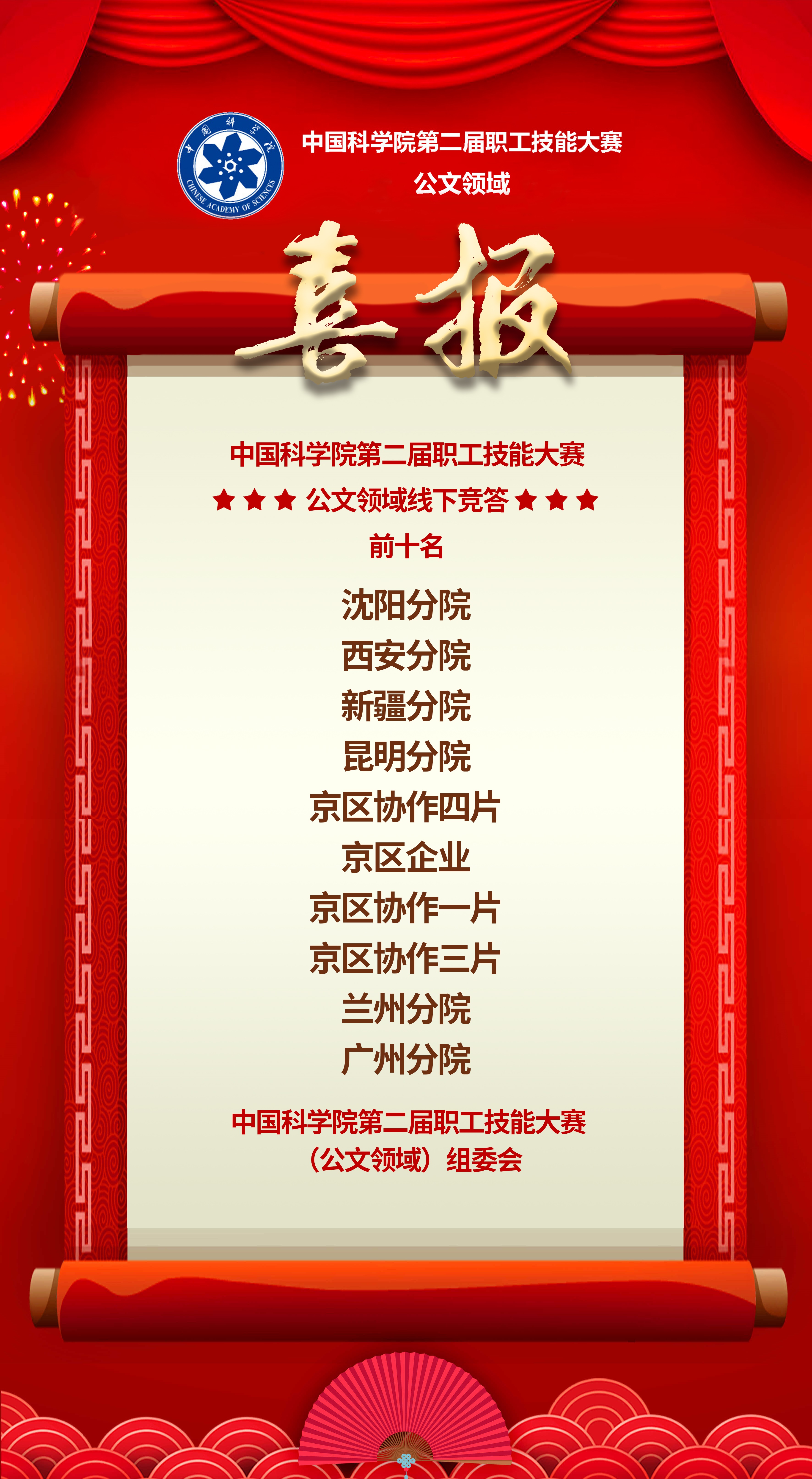 最終,公文處理線下競答決賽前十名依次是沈陽分院、西安分院、新疆分院、昆明分院、京區協作四片、京區企業、京區協作一片、京區協作三片、蘭州分院、廣州分院。按照公文寫作和公文處理線下競答綜合成績,沈陽分院代表隊榮獲公文領域團體一等獎,昆明分院代表隊、新疆分院代表隊獲得團體二等獎,京區協作四片代表隊、西安分院代表隊、京區協作一片代表隊獲得團體三等獎,京區協作三片代表隊、京區企業代表隊、廣州分院代表隊、蘭州分院代表隊獲得團體優勝獎。頒獎儀式上,李和風,院直屬機關黨委副書記、院工會常務副主席楊旭,蔡長塔,毛志遠,沈陽自動化所黨委書記兼副所長孫雷分別為獲得公文領域團體獎、公文處理線下競答前十名、公文處理能手、公文寫作領域技能標兵的代表隊及個人頒獎,沈陽分院紀檢組組長、分黨組成員楊宏主持頒獎儀式。