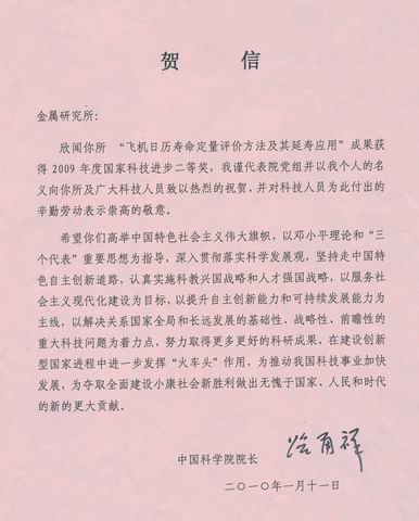 1月11日,在2009年度國家科技獎勵大會上,以韓恩厚、張棟、柯偉、陳群志、王儉秋等為主要完成人的“飛機日歷壽命定量評價方法及其延壽應用”榮獲了2009年度國家科技進步二等獎。全國人大常委會副委員長、中國科學院院長路甬祥向金屬所發出賀信,向金屬所及廣大科技人員致以熱烈的祝賀,并對科技人員付出的辛勤勞動表示崇高的敬意。
