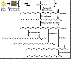 在總結分析目前生物燃料科學前沿最新進展的基礎上,文章創新性地提出了基因工程藍藻制備新型優質脂肪酸類生物燃料的研究思路,即在單一生物體內利用太陽能與二氧化碳直接合成制備具有高能量密度、低吸濕性、低揮發性、且與現存發動機設備和運輸設施相兼容等性能的新型優質脂肪酸類太陽能生物液體燃料(圖2)。