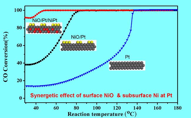 在眾多的催化過程中,催化活性中心往往是配位不飽和的金屬原子,這些物種具有亞穩態、可變化的特征,因而表現出高度的催化活性;另一方面,維持這種非穩態物種需要提供合適的化學環境來對其進行適度的限制作用。因此,催化活性中心的可變性和限域環境所表現出的不變性是催化的根本特征。基于納米和界面尺度上的催化限域作用,該研究組在貴金屬Pt表面上創造性構建了具有配位不飽和的亞鐵納米結構,成功地實現了室溫條件下分子氧的高效活化,由此發展出“界面限域催化”的概念(Science, 2010, 328, 1141-1144;Journal of Physical Chemistry C, 2010, 114, 17069-17079)。近日,慕仁濤、傅強和包信和等人將這一概念擴展到PtNi催化體系,發現界面限域的配位不飽和Ni物種及其在低溫氧化反應中的重要作用;結合表面科學實驗和真實催化劑的研究,進一步揭示了次表層Ni對表面催化反應的促進作用。穩定在Pt表面上的單層分散NiO納米結構提供界面限域的配位不飽和Ni物種來解離分子氧,Pt表面下的次表層Ni物種能夠降低CO與原子氧的基元反應活化能,兩者表現出協同催化作用的機制。據此構建的具有NiO/Pt/PtNi三明治結構具有高效的催化CO氧化反應的活性。