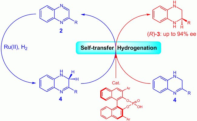 在研究芳香化合物喹喔啉不對稱氫化反應的過程中,研究人員發現一個新穎的手性歧化反應的收斂現象。反應通過中間體二氫喹喔啉進行,在手性磷酸催化劑的促進下發生手性自歧化氫轉移反應得到原料喹喔啉和最終手性產物,而產生的原料喹喔啉又可以在Ru(II)的催化作用下選擇性加氫得到中間體二氫喹喔啉來反復進行自歧化氫轉移反應,理論計算研究進一步證實了上述反應機理。此發現對于設計和發展新的不對稱反應提供了一種新的思路。