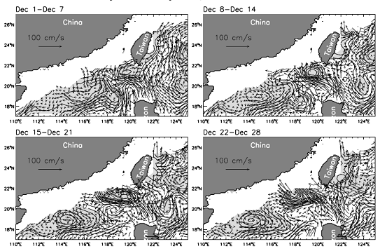 Yuan et al. (2006, JGR-Ocean)采用多衛星參數資料首次發現呂宋海峽黑潮路徑以季節內變化為主的特征。觀測顯示,呂宋海峽黑潮的路徑以平直路徑為主,反氣旋式大彎曲入侵只在年平均不到30%的時間出現,并且是一年四季均存在的現象。反氣旋式大彎曲較頻繁地發生于冬季,與冬季此處盛行東北風有關,但持續時間也僅占冬季的1/3。而黑潮的“流套現象”只是偶爾發生的現象,且夏季多于冬季。這些觀測結果說明呂宋海峽黑潮的反氣旋式入侵是一種瞬時現象而不是以前認為的穩定的環流形態。藉此袁東亮等人提出黑潮在呂宋海峽反氣旋式入侵的消長與太平洋一側中尺度渦旋的活動有密切關系的科學假設。
