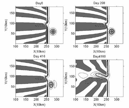為了證明該假設,袁東亮課題組與侯一筠課題組合作,進一步把非線性動力系統理論引入物理海洋學環流研究中來,取得了一系列研究成果。袁東亮和李銳祥(2008,《熱帶海洋學報》)最先成功揭示了中尺度渦旋對處于遲滯變異臨界狀態的西邊界流的影響,Wang et al. (2010, CJOL)研究了經向風(季風)所產生的艾克曼輸運對西邊界流在缺口處流徑遲滯變異過程的影響。Yuan and Wang (2011, JPO)詳細討論了西邊界流在缺口處的非線性遲滯回歸依賴斜壓變形半徑的變異過程,指明了西邊界流流徑轉變受中尺度渦旋影響的動力機制。研究表明,氣旋和反氣旋中尺度渦旋都可能使西邊界流產生由入侵流態到跨越流態的轉變,而只有反氣旋中尺度渦才能誘發西邊界流由跨越流態向入侵流態的轉變。其動力機制都是由于渦度平衡受外力的瞬時擾動而發生狀態不可逆的躍遷造成的。當西邊界流流量遠離其臨界狀態時,研究表明其流徑不易受經向風場和中尺度渦旋的影響。