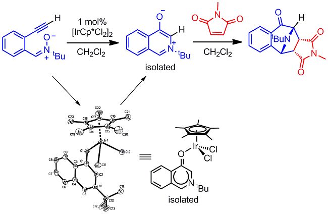 金屬或有機分子催化的亞甲胺葉立德(Azomethineylide)和親偶極體的1,3-偶極環(huán)加成反應是組建多圓雜環(huán)的一種簡潔而高效的方法。李興偉研究組發(fā)現(xiàn),被硝酮官能化的末端炔在金屬銥催化下可以很容易地生成可分離的高活性亞甲胺葉立德。該組首次分離出了亞甲胺葉立德以及及其金屬配合物,并通過晶體衍射表征了一類結(jié)構罕見的氧配位的銥絡合物。反應中生成亞甲胺葉立德的過程也經(jīng)歷了類似的氧轉(zhuǎn)移,但選擇性卻與金催化體系不同,并能實現(xiàn)互補,葉立德與親偶極體的1,3-偶極環(huán)加成反應證明了這一方法的有效性。這兩篇論文將有助于有機合成工作者在這一領域進行更加深入的探索和研究。