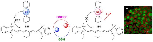 韓克利研究組根據生物體內的硒酶催化原理,開發出一個近紅外含硒功能團的熒光探針,用于過氧化亞硝酸的可逆檢測。在生理條件下,該探針可用于過氧化亞硝酸鹽的氧化/還原事件的高靈敏度、高選擇性的監測。該探針可有效地避免細胞自發熒光的影響,在水溶液和活細胞進行的測試中均給予了積極的信號近紅外熒光響應, 并給出了詳細相互作用機理。研究人員還成功拍攝了細胞中過氧化亞硝酸鹽濃度變化的實時圖像。